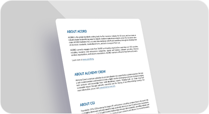 ABOUT ACORD ACORD is the global standards-setting body for the insurance industry. For 50 years, we have been an industry leader in identifying ways to help its members make improvements across the insurance value chain. ACORD facilitates fast, accurate data exchange and efficient workflows through the development of electronic standards, standardized forms, and tools to support their use. ACORD currently engages more than 36,000 participating organizations spanning over 100 countries, including insurance and reinsurance companies, agents and brokers, software providers, financial services organizations, and industry associations. ACORD maintains offices in New York and London. Learn more at www.acord.org. ABOUT ALCHEMY CREW Alchemy Crew is a venture validation & commercialisation lab supported by a global ecosystem. We take a well-curated problem and transform it into a digital solution leveraging a network of global emerging tech ventures and knowledge from multi-disciplinary experts. Merging both, we create long-term sustainable impact through authentic execution and the sharing of our differentiating learnings. For more information, please visit www.alchemycrew.com. ABOUT CGI Founded in 1976, CGI is among the largest IT and business consulting services firms in the world. We are insights-driven and outcome-based to help accelerate returns on your IT and business investments. In all we do, our goal is to build trusted relationships through client proximity, providing industry and technology expertise to help you meet the needs of your customers and citizens. For more information, please visit www.cgi.com. © 2021 ACORD Corporation. All rights reserved. The ACORD name and logos are among the registered trademarks and trademarks of ACORD Corporation in the United States and other countries. Other trademarks cited herein are the property of their respective owners. All data in this report are sourced from S&P Global, Glassdoor, company filings, and 2021 ACORD / Alchemy Crew analysis.