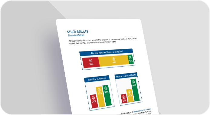 STUDY RESULTS Financial Metrics Although Superior Performers accounted for only 10% of the revenue generated by the 40 insurers studied, their cash flow and returns were disproportionately higher. Five-Year Revenues (Percent of Study Total) 30% 60% 10% Cash Flow vs. Revenue Revenue vs. Invested Capital 44% 44% 38% 37% 38% 37% 25% 24% 25% 24% 17% 17% Cash Flow vs. Revenue Revenue vs. Invested Capital Cash Flow vs. Revenue Revenue vs. Invested Capital Cash flow divided by revenue is essentially a measure of profitability, while revenue divided by invested capital represents how efficiently an insurer leverages its assets. By achieving superior performance across these metrics, the top quartile generated cash flow returns materially in excess of the study average. EUROPEAN INSURER VALUE ANALYSIS 3