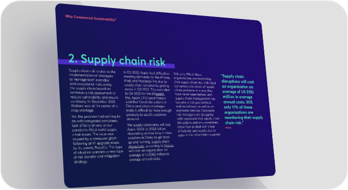 Why Commercial Sustainability? 2. Supply chain risk Supply chain risk relates to the In Q2 2022, Apple had difficulties Still, only 11% of these “Supply chain implementation of strategies meeting demands for the iPhone, organizations are monitoring disruptions will cost to manage both everyday iPad, and MacBook Pro due to their supply chain risk. Individual an organization an and exceptional risks along supply chain constraints getting consumers are aware of supply the supply chain based on worse in Q3 2022. This extended chain problems in a way they average of US $182 continuous risk assessment to to Q4 2022 for the iPhone14 have never been before, and million in average reduce vulnerability and ensure Pro. Apple CFO Luca Maestri supply chain management has annual costs. Still, continuity. In December 2021, said that Covid disruptions in become a hot geo-political Walkers was at the center of a China and silicon shortages and social topic as well as an only 11% of these crisp shortage. make it difficult to make enough economic one too. Corporate organizations are Yet, the problem had nothing to products to satisfy customer risk managers are struggling monitoring their supply do with congested containers, demand. with unprecedented supply chain lack of lorry drivers, or our The supply constraints will cost disruptions and only sometimes chain risk.” pandemic-filled world supply Apple US$4 to US$8 billion, know how to deal with those Interos chain issues. The issue was depending on how long it takes effectively and rapidly due to caused by a computer glitch suppliers in China to get back gaps in the information supplied. following an IT upgrade made up and running. Supply chain by its parent, PepsiCo. This type disruptions, according to Interos of situation warrants a new type will cost an organization an of risk transfer and mitigation average of US$182 million in strategy. average annual costs.