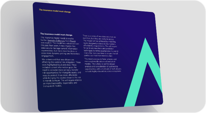 The insurance model must change The insurance model must change. There is a tonne of new data sets that are The insurance model needs to evolve out there, but they are costly to access. further. Leandro Dallemule from Planck The impact will be achieved by matching was explicit. The model has advanced over newly designed products to the market’s the past four years. It now ingests new affordability requirements. This will require data sets to manage current information for us to use new tools and prediction asymmetries, but more must be done to techniques to refine assumptions in a world ease more dynamic pricing and frictionless that is far more real-time to ensure that all engagement. parties see that their interests align. We understand that new drivers are This means access to fairer, simpler, and affecting the world of risk mitigation. These more explainable advanced analytical were highlighted loud and clear. These models. This is likely to call for deeper included current information gaps, the analysis and consideration of partnership need to consider more seriously transfer opportunities with a multitude of tech players risk opportunities for intangible assets, and to build highly relevant insurance ecosystems. ways to protect those more affordably while bringing the capital closer to the risk it intends to insure. This will require reliance on more trustworthy, responsible, and transparent models.