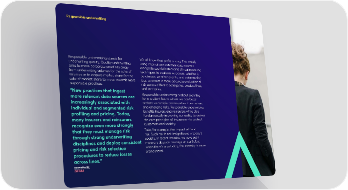 Responsible underwriting Responsible underwriting stands for We all know that profit is king. This entails underwriting quality. Quality underwriting using internal and external data sources aims to move corporate practices away alongside sophisticated and ethical modeling from underwriting volumes for the sake of techniques to evaluate exposure, whether it volumes or to acquire market share for the be climate, weather events, and catastrophic sake of market share to move towards more loss, to ensure a more accurate evaluation of responsible practices. risk across different categories, product lines, “New practices that ingest and territories. more relevant data sources are Responsible underwriting is about planning for a resilient future where we can better increasingly associated with protect vulnerable communities from current individual and segmented risk and emerging risks. Responsible underwriting profiling and pricing. Today, benefits insurers and reinsurers while also fundamentally improving our ability to deliver many insurers and reinsurers the core principles of insurance - to protect recognize even more strongly customers and society. that they must manage risk Take, for example, the impact of flood through strong underwriting risk. Such risk is not insignificant in today’s disciplines and deploy consistent society. In recent months, we have seen more dry days on average on earth, but pricing and risk selection when there’s a wet day, the intensity is more procedures to reduce losses pronounced. across lines.” Deana Murfitt Artificial