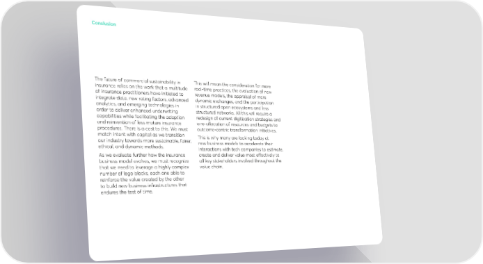 Conslusion The future of commercial sustainability in This will mean the consideration for more insurance relies on the work that a multitude real-time practices, the evaluation of new of insurance practitioners have initiated to revenue models, the appraisal of more integrate data, new rating factors, advanced dynamic exchanges, and the participation analytics, and emerging technologies in in structured open ecosystems and less order to deliver enhanced underwriting structured networks. All this will require a capabilities while facilitating the adaption redesign of current digitization strategies and and reinvention of less mature insurance a re-allocation of resources and budgets to procedures. There is a cost to this. We must outcome-centric transformation initiatives. match intent with capital as we transition This is why many are looking today at our industry towards more sustainable, fairer, new business models to accelerate their ethical, and dynamic methods. interactions with tech companies to estimate, As we evaluate further how the insurance create and deliver value most effectively to business model evolves, we must recognize all key stakeholders involved throughout the that we need to leverage a highly complex value chain. number of lego blocks, each one able to reinforce the value created by the other to build new business infrastructures that endures the test of time.