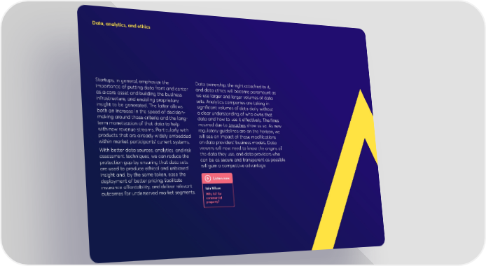 Data, analytics, and ethics Startups, in general, emphasize the Data ownership, the right attached to it, importance of putting data front and center and data ethics will become paramount as as a core asset and building the business we use larger and larger volumes of data infrastructure, and enabling proprietary sets. Analytics companies are taking in insight to be generated. The latter allows significant volumes of data daily without both an increase in the speed of decision- a clear understanding of who owns that making around those criteria and the long- data and how to use it effectively. The fines term monetization of that data to help incurred due to breaches show us so. As new with new revenue streams. Particularly with regulatory guidelines are on the horizon, we products that are already widely embedded will see an impact of those modifications within market participants’ current systems. on data providers’ business models. Data With better data sources, analytics, and risk viewers will now need to know the origins of assessment techniques, we can reduce the the data they use, and data providers who protection gap by ensuring that data sets can be as secure and transparent as possible are used to produce ethical and unbiased will gain a competitive advantage. insight and, by the same token, ease the deployment of better pricing, facilitate Listen now insurance affordability, and deliver relevant Iain Wilcox outcomes for underserved market segments. Why IoT for commercial property?