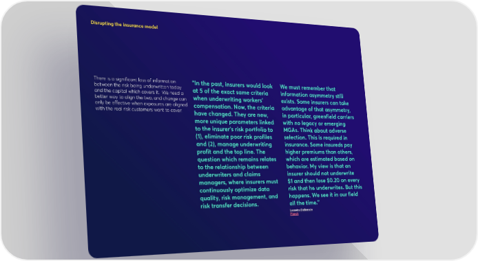Disrupting the insurance model There is a significant loss of information “In the past, insurers would look We must remember that between the risk being underwritten today at 5 of the exact same criteria information asymmetry still and the capital which covers it. We need a when underwriting workers’ exists. Some insurers can take better way to align the two, and change can only be effective when exposures are aligned compensation. Now, the criteria advantage of that asymmetry, with the real risk customers want to cover. have changed. They are new, in particular, greenfield carriers more unique parameters linked with no legacy or emerging to the insurer’s risk portfolio to MGAs. Think about adverse (1), eliminate poor risk profiles selection. This is required in and (2), manage underwriting insurance. Some insureds pay profit and the top line. The higher premiums than others, question which remains relates which are estimated based on to the relationship between behavior. My view is that an underwriters and claims insurer should not underwrite managers, where insurers must $1 and then lose $0.20 on every continuously optimize data risk that he underwrites. But this quality, risk management, and happens. We see it in our field risk transfer decisions. all the time.” Leandro Dallemule Planck