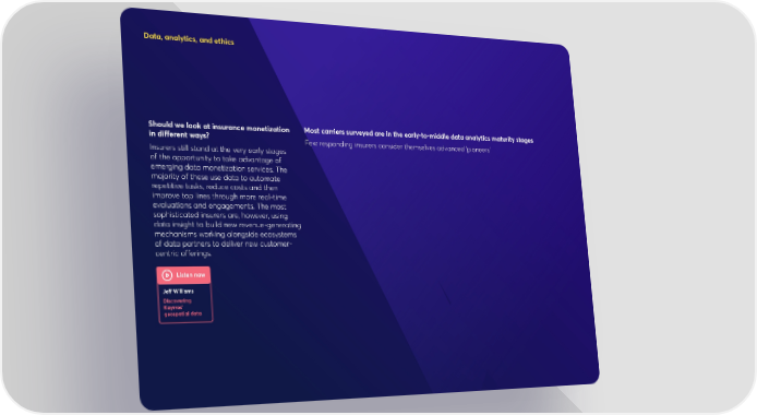 Data, analytics, and ethics Should we look at insurance monetization Most carriers surveyed are in the early-to-middle data analytics maturity stages in different ways? Few responding insurers consider themselves advanced ‘pioneers’ Insurers still stand at the very early stages of the opportunity to take advantage of emerging data monetization services. The majority of these use data to automate repetitive tasks, reduce costs and then improve top lines through more real-time evaluations and engagements. The most sophisticated insurers are, however, using data insight to build new revenue-generating mechanisms working alongside ecosystems of data partners to deliver new customer- centric offerings. Listen now Jeff Williams Discovering Kayrros’ geospatial data