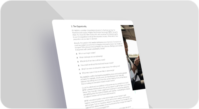3. The Opportunity It’s helpful to consider a hypothetical situation to illustrate just how far insurance could evolve. Imagine that Amazon has bought BMW. You work there. You have USD $1bn to play with, and you know that Amazon wants to use this acquisition to disrupt the insurance industry. What kind of new proposition are you keen to develop? Actually, the question that needed addressing was what kind of propositions could we create in a world that is changing and transitioning to new modes of transport? What do we think our Mobility-as-a-Service offering could look like in alignment with current sustainability trends? Who is our target market? What challenges are we addressing? What kinds of services could we create? How would we disrupt the traditional insurer market? What if we were not allowed to make money from selling cars? What new types of risk are we likely to see emerge? We needed to confirm the baseline assumptions about what services people will need. For example, virtually every car manufacturer that I talk with believes that selling cars is not how they will be making money in the future – they’re looking at subscription-based models instead. Could the vehicle act as a platform in the same way as a smartphone does? BMW is already thinking about this, as they expect to sell far fewer cars in the future. They have also made a significant investment in analyzing, assessing and defining what the future of mobility will look like—evaluating the impact on adjacent sectors such as finance and insurance. BMW is an active investor in new technologies across transport and logistics, travel and hospitality, vehicle, environment, energy, and emerging technologies. From an insurance viewpoint, they explore how the electric and autonomous vehicle markets will evolve and what the changes will mean for customers’ end-to-end engagement. In brief, how can we analyze macro trends? Can we anticipate disruption within operations, futureproof our value chains, and seek to serve customers’ different and evolving needs in a simple, engagement-led and integrated way? This is the kind of deep thinking and analysis insurers need to anticipate so they can develop methods of minimizing the effects of change and disruption to become more sustainable, to grow, and to thrive. 33