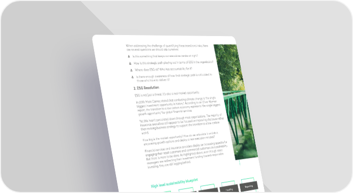 When addressing the challenge of quantifying these transitional risks, there are several questions we should ask ourselves: Is this something that keeps our executives awake at night? How is this strategic path playing out in terms of ESG in the organization? Where does ESG sit? Who has accountability for it? Is there enough awareness of how that strategic path is articulated to those who have to deliver it? 2. ESG Resolution ESG is not just a threat. It’s also a real market opportunity. In 2019, Mark Carney stated that combating climate change is ‘the single biggest investment opportunity in history’. According to an Oliver Wyman report, the transition to a low carbon economy represents ‘the single biggest growth opportunity’ for global financial services. Yet this hasn’t percolated down through most organizations. The majority of insurance executives still appear to be focused on improving disclosure rather than revising business strategy to support the transition to a low-carbon world. How big is the market opportunity? How do we articulate it and start uncovering growth options and deploy a new execution mindset? Financial services and insurance providers display an increasing appetite for engaging their retail customers and commercial customers on sustainability. But there is more to be done. As highlighted above, even though asset managers are redirecting their investment funding towards responsible investing, they are still lagging behind. High level sustainability blueprint Financing Investing Analyzing Insuring Reporting P2P lending & Portfolio Geospatial Transition risk PCAF, TCFD, microfinancing evaluation analysis modeling CPA, CASB, CDP reporting TransitionTech Thematic fund 1.5e modeling P&C risk Impact reporting programming creation assessment Commercial ESG scoring Scope 1, 2, Historical claims Shareholder project financing for traded 3 carbon review advocacy voting companies accounting Green bond Deal-flow Climate risk Risk vs. impact Annual reporting insurance analysis service analysis evaluation & regulation compliance Electrification/ Transitional Fossil fuel Biodiversity Transition risk gasification divestment dependency risk protection premium accounting guidance modeling modeling Source: Based Redsand Ventures workshop design for 4th March 2021 30