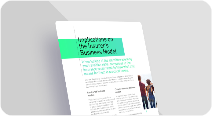 Implications on the Insurer’s Business Model When looking at the transition economy and transition risks, companies in the insurance sector want to know what that means for them in practical terms. How can they change their business models to mitigate the risk and take advantage of the upside opportunity? From our extensive research, we’ve identified three types of business models that successful companies have been adopting in recent years: Service-led business Circular economy business models models Products are shifting away from In practical terms, this involves ownership to usage - to products and moving away from the take, make services that are shared, streamed, and dispose of the linear model we or leased. Many companies doing are used to, and moving towards a well with their transition use this to circular, closed-loop business model, utilize resources more efficiently and which requires recycling, reusing and significantly reduce waste. repurposing every extendable asset Take the example of Apple - recently within our value chains. named by analysts as one of the Italian bancassurer Intesa Sanpaolo best-managed businesses worldwide. has been implementing circular The iPhone is one of its products, economic strategies for years. while the Apple iPhone upgrade In the InsurTech space, Swedish program represents the service. By InsurTech Omocom has developed moving people from buying the a parametric model to enable the device to its upgrade program, Apple insurance of circular business models. can start meeting its customer needs with access to the latest products and ensure that its iPhones are recycled properly across its value chain. There are many other examples, but the fact that the world’s best-known company is more and more reliant upon a service model should give us all pause to think about how to incorporate this kind of model in our businesses. 38