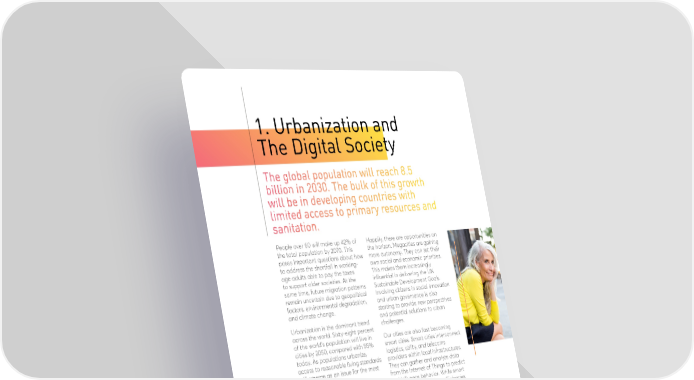1. Urbanization and The Digital Society The global population will reach 8.5 billion in 2030. The bulk of this growth will be in developing countries with limited access to primary resources and sanitation. People over 60 will make up 42% of Happily, there are opportunities on the total population by 2070. This the horizon. Megacities are gaining poses important questions about how more autonomy. They can set their to address the shortfall in working- own social and economic priorities. age adults able to pay the taxes This makes them increasingly to support older societies. At the influential in delivering the UN same time, future migration patterns Sustainable Development Goals. remain uncertain due to geopolitical Involving citizens in social innovation factors, environmental degradation, and urban governance is also and climate change. starting to provide new perspectives Urbanization is the dominant trend and potential solutions to urban across the world. Sixty-eight percent challenges. of the world’s population will live in Our cities are also fast becoming cities by 2050, compared with 55% smart cities. Smart cities interconnect today. As populations urbanize, logistics, utility, and telecoms access to reasonable living standards providers within local infrastructures. will emerge as an issue for the most They can gather and analyze data vulnerable. from the Internet of Things to predict The search for better economic and influence behavior. While smart opportunities will likely increase and technologies can deliver efficiencies lead to further issues with social and cost savings, they also introduce cohesion. Europe’s population a new raft of data privacy and projections suggest that, barring security risks that will need to be a significant restructuring of the addressed. economy or welfare policy, the continent will need to increase the immigration of working‐age people from outside of Europe to support an aging population. Environmental and climate change are major drivers of international and urban migration. When droughts led to crop failures and water shortages in Western Asian regions, the resulting migration to cities led to rising unemployment, political unrest, limited access to food and sanitation, and finally, to open conflict. 13
