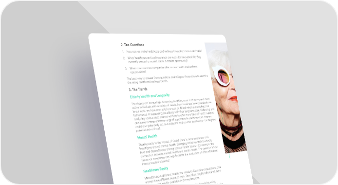 2. The Questions 1. How can we make healthcare and wellness innovation more sustainable? 2. What healthcare and wellness areas are ready for innovation? Do they currently present a market risk or a market opportunity? 3. What can insurance companies offer as new health and wellness opportunities? The best way to answer these questions and mitigate these risks is to examine the rising health and wellness trends. 3. The Trends Elderly Health and Longevity The elderly are increasingly becoming healthier, more tech-savvy and more active individuals with a variety of needs, from loneliness to augmented care. In our work, we have seen solutions such as AI-led rehab support become instrumental in supporting the elderly with their long term care. Collecting and analyzing various data sources will help to offer more tailored health support and a more comprehensive range of supportive financial services. Insurers could also potentially act as a collector and covener in this area - limiting the potential risk of fraud. Mental Health Thanks partly to the impact of Covid, there is more awareness and less stigma around mental health. Emerging initiatives seek to identify links and dependencies among various health issues – for example, the connection between mental health and cardio health. The question is how insurance companies can help facilitate the evaluation of often siloed but interconnected ailments? Healthcare Equity Minorities have different healthcare needs to Caucasian populations, and women have different needs to men. They often require tailored solutions which are not readily available in the marketplace. Much work is being done to develop personalized medicine, using pharmacogenomics among other advanced technologies, specific to the insurance needs of women or minorities. How can insurers think out of the box to protect, prevent and mitigate unforeseen risks and make access to treatment affordable to underserved consumer groups? Data Ethics and AI Biases Ethics and biases embedded within advanced analytical models being created today are gradually being recognized as one of the most significant issues across the healthcare sector. We need to start asking ourselves how insurers can work together to eliminate and mitigate endemic discrimination and exclusion resulting from poorly designed AI models. Wellness Homes Wellness homes could provide more sustainable living environments for all incomes, ages, and healthcare conditions. Some homes are being developed from the ground up. Others are retrofitted with new designs and technologies. Data capture and analysis becomes a core part of the design of these smart and sustainable homes. What would such designs imply in terms of insurance products and services? 35