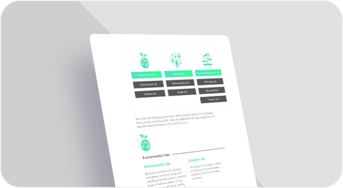 Environmental risks Societal risks Governance & economic risks Environmental risk Talent aquisition risk Technology risk Emission risk Worker risk Value chain risk Financial risk New risks are emerging as we learn what transition means for businesses, the economy, and the public. Here are additional risk types we believe will become more prominent in the next few years: Environmental risks Environmental risk Emission risk Business activities such as water The impact of emission-related withdrawal, chemical usage and activities on the environment, anything else that poses a potential including CO2 and methane threat of adverse effects on the emissions. environment by effluents, wastes, or resource depletion. Also includes deficiencies in waste management, including water contamination, spillages, oil discharge, and hazardous waste disposal. Societal risks Talent acquisition risk Worker risk Includes the impact of corporations’ The impact of work and business activities and decisions when activities on employees and recruiting talent from generation Y contractors. These would include and Z, who seem more inclined to days away from work, injuries and evaluate and join a business based fatalities, and issues with process on its sustainability principles. safety and severe vehicle and on-the- job accidents. This also relates to the impact of business activities on the public and society. 24