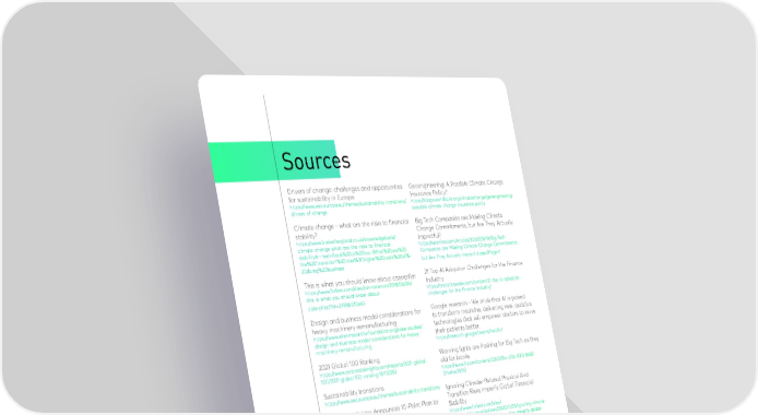 Sources Drivers of change: challenges and opportunities Geoengineering: A Possible Climate Change for sustainability in Europe Insurance Policy? https://www.eea.europa.eu/themes/sustainability-transitions/ https://blogs.worldbank.org/climatechange/geoengineering- drivers-of-change possible-climate-change-insurance-policy Climate change - what are the risks to financial Big Tech Companies are Making Climate stability? Change Commitments, but Are They Actually https://www.bankofengland.co.uk/knowledgebank/ Impactful? climate-change-what-are-the-risks-to-financial- https://eponline.com/Articles/2020/08/10/Big-Tech- stability#:~:text=Back%20to%20top-,What%20are%20 Companies-are-Making-Climate-Change-Commitments- the%20'transition'%20risks%3F,higher%20costs%20of%- but-Are-They-Actually-Impactful.aspx?Page=1 20doing%20business This is what you should know about caterpillar 21 Top AI Adoption Challenges for the Finance https://www.forbes.com/sites/jonmarkman/2018/04/26/ Industry this-is-what-you-should-know-about- https://analyticsweek.com/content/21-top-ai-adoption- caterpillar/?sh=2798612f3e43 challenges-for-the-finance-industry/ Design and business model considerations for Google research - We think that AI is poised heavy machinery remanufacturing to transform medicine, delivering new, assistive https://www.ellenmacarthurfoundation.org/case-studies/ technologies that will empower doctors to serve design-and-business-model-considerations-for-heavy- their patients better. machinery-remanufacturing https://research.google/teams/health/ 2021 Global 100 Ranking Warning lights are flashing for Big Tech as they https://www.corporateknights.com/reports/2021-global- did for banks 100/2021-global-100-ranking-16115328/ https://www.ft.com/content/335f279a-c72a-4313-8dd2- Sustainability transitions 311a4ee39312 https://www.eea.europa.eu/themes/sustainability-transitions Ignoring Climate-Related Physical And UK Prime Minister Announces 10-Point Plan to Transition Risks Imperils Global Financial Boost Green Economy Stability https://www.globalelr.com/2020/11/uk-prime-minister- https://www.forbes.com/sites/ announces-10-point-plan-to-boost-green-economy/ mayrarodriguezvalladares/2020/11/23/ignoring-climate- related-physical-and-transition-risks-imperils-global- Value chain - risk to resilience financial-stability/?sh=181bea736041 https://www.bsr.org/en/collaboration/groups/value-chain- Learn all about Stripe and how it works risk-to-resilience https://www.analyticssteps.com/blogs/learn-all-about- The business model of Caterpillar stripe-and-how-it-works https://businessmodelsinc.medium.com/the-business- model-of-caterpillar-64a5aad97a73 Smart at Scale - Cities to watch http://www3.weforum.org/docs/WEF_Smart_at_Scale_ Cities_to_Watch_25_Case_Studies_2020.pdf Parametric Insurance for Solar Geoengineering: Insights from the Pacific Catastrophe Risk Assessment and Financing Initiative https://keith.seas.harvard.edu/files/tkg/files/1758-5899.12864. pdf?m=1602689427 46