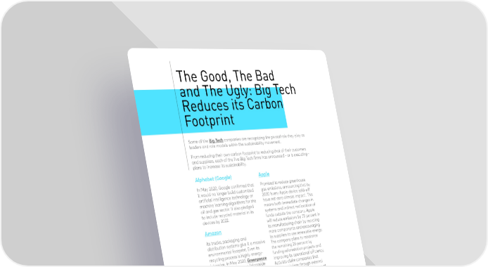 The Good, The Bad and The Ugly: Big Tech Reduces its Carbon Footprint Some of the Big Tech companies are recognizing the pivotal role they play as leaders and role models within the sustainability movement. From reducing their own carbon footprint to reducing that of their customers and suppliers, each of the five Big Tech firms has announced - or is executing - plans to increase its sustainability. Alphabet (Google) Apple In May 2020, Google confirmed that Promised to reduce greenhouse it would no longer build customized gas emissions, announcing that by artificial intelligence technology or 2030 ‘every Apple device sold will machine learning algorithms for the have net-zero climate impact’. This oil and gas sector. It also pledged means both immediate changes in to include recycled material in its systems and indirect reallocation of devices by 2022. funds outside the company. Apple will reduce emissions by 75 percent in Amazon its manufacturing chain by recycling Its trucks, packaging and more components and encouraging distribution systems give it a massive its suppliers to use renewable energy. environmental footprint. Even its The company plans to rebalance recycling process is highly energy- the remaining 25 percent by intensive. In May 2020, Greenpeace funding reforestation projects and also called out Amazon (alongside improving its operational efficiency. Google and Microsoft) for using AI Activists claim companies that and cloud computing devices to help offset emissions through external oil producers find and extract oil funding allow emissions to ‘grow at and gas deposits. In an attempt to a time when the scientific consensus reduce its carbon footprint, Amazon demands that emissions be cut in has invested in or developed 127 half by 2030 to avoid the worst renewable energy projects and effects of climate change—and be declared itself the most prominent reduced to zero by 2050’. corporate buyer of renewable Microsoft energy in 2020. It also convinced 13 companies, including Microsoft and Asked its suppliers to report Unilever, to join its Climate Pledge emissions. In September 2020, initiative in 2019. Microsoft was reported as having explored underwater data centers. Facebook The company also announced the Has taken a hit for not censoring second phase of its AI for Earth the spread of misinformation about program – a new biodiversity climate change on its platform. initiative in the form of a ‘Planetary The company confirmed it would Computer’. And it announced plans use 100 percent renewable energy to become ‘water positive’, meaning in its facilities and reduce its data it will replenish more water than it centers’ water usage. But it has yet to consumes by the end of the decade. demonstrate how it intends to stop So are those good, bad or ugly? the spread of climate disinformation. 27