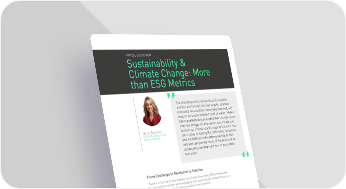 VIRTUAL DISCUSSION Sustainability & Climate Change: More than ESG Metrics The challenge of transition faced by industry and its race to meet climate targets, whether internally measured or externally imposed, will require an unprecedented level of action. History has repeatedly demonstrated that change comes from the fringe, not the center, and mostly it is Nicole Anderson bottom-up. Private market capital has a serious CEO & Managing Partner role to play in fueling the technology innovation Redsand Ventures and the brilliant entrepreneurial minds that will and can provide many of the solutions so desperately needed right now to accelerate execution. From Challenge to Resolution to Solution There is a 3-point Environmental, Social and Governance (ESG) framework for insurers to evaluate when engaging with sustainability-related initiatives— setting paths ‘From challenge to resolution and solution’. 1. ESG Challenges ESG is now worth around USD $40trn in funds being funneled to the most efficient fossil fuel users and adopters of renewables to drive the transition to better energy sources. More than 450 investors managing these funds have now signed up to Climate Action 100+ climate initiative program. Still, the space remains highly heterogeneous. Investors, asset managers, and ESG rating providers differ on which issues are important and how to address them best. As a result, defining ESG is almost impossible. Even creating consistency around scoring ESG is a challenge, with about 300 ESG data providers in the market already. According to a Deloitte report, just 3-5% of insurers are prepared for climate change-related liability - physical and transitional risk. Now they must consider transition risk as part of a larger agenda. 29