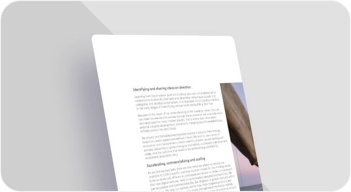 Identifying and sharing ideas on direction Learning from the investors’ ‘portfolio thinking’ approach is fundamental for corporations to diversify their bets and determine venturing proposals that categorize and develop incrementally. It is important not to constrain choices in the early stages of indentifying venture leads and building deal flow. Because of the depth of our understanding of the insurance value chain, we can often accelerate this process through the ecosystems we have indentified and developed for many market players. This is where open innovation, external network development, and priority mapping become essential steps to help connect the dots faster. Structured and formalized mechanisms must be in place to filter findings based on clearly agreed and defined criteria. We tend to use a series of evaluation and measurement criteria linked to whether we are dealing with process, sustaining or game-changing innovations, a company’s development stage, and the outcome that needs to be achieved (e.g. partnership, investment, acquisition, etc.). Accelerating, commercializing and scaling As we find our best bets, there are also instances where no options are available to fulfill a specific customer solution-market fit. The thinking needs to be so drastically different to yield expected returns (or shake up the sector) that new digital ventures need to be evaluated, designed and launched. We can accelerate and commercialize the due diligence of growth ventures within operations. We help our partners deliver new, more targeted products and services or augment existing value chains through experimentation, testing, and iterative evaluation. We also evaluate the businesses of tomorrow to build winning ventures based on what we learn from current digital successes. 42