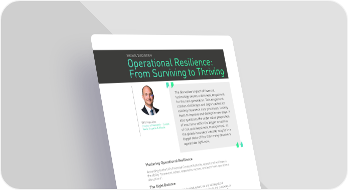 VIRTUAL DISCUSSION Operational Resilience: From Surviving to Thriving The disruptive impact of financial technology seems a dominant megatrend for the next generation. This megatrend creates challenges and opportunities for existing insurance core processes, forcing them to improve and disrupt in new ways. It Will Hawkins also questions the wider value proposition Director of Research – Europe of insurance within the bigger universes Keefe, Bruyette & Woods of risk and investment management, as the global insurance industry may be in a bigger state of flux than many observers appreciate right now. Mastering Operational Resillience According to the UK’s Financial Conduct Authority, operational resilience is the ability “to prevent, adapt, respond to, recover, and learn from operational disruptions”. The Right Balance The real question for insurers is to what extent we are talking about operational resilience being a product that you provide to the customer, or a service that means your customer doesn’t need the products as they’re currently structured? Indeed, an active investor assumes that market efficiency occurs in the future, not the present and therefore plans for uncertainties and any disruption in macroeconomic trends. While often centralized, operational resilience requires the right balance between risk management, business management and customer engagement. 36